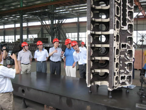 圖爲陳(chén)敏爾常務副省長(zhang)在集團董事長朱(zhū)金根、副總方毅和(he)杭機鑄造總經理(lǐ)鄭金濤陪同下參(cān)觀鑄件成品車間(jiān)現場。