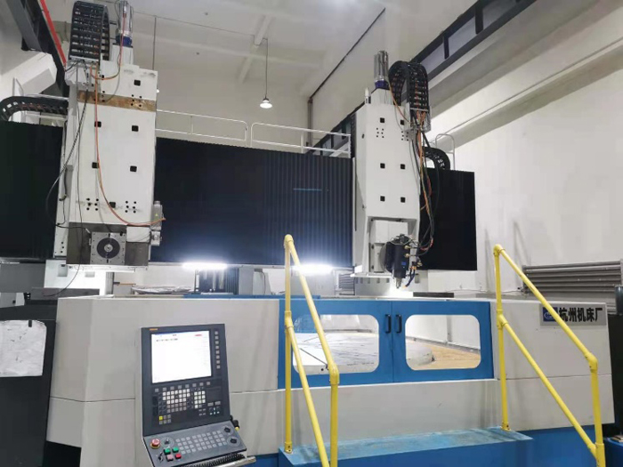 本(ben)機床采(cǎi)用龍門(mén)框架移(yi)動式結(jie)構布局(ju),由雙床(chuang)身架、橫(heng)梁及橫(heng)👅梁支座(zuo)組成一(yī)個剛性(xing)框架結(jié)構,中間(jian)是直徑(jing) 3m 的(de)靜壓回(hui)轉工作(zuo)台( C 軸)。機床(chuáng)具有 X 、 Y 、 Z 三(sān)個平動(dòng)軸,橫梁(liang)沿雙床(chuáng)身架上(shàng)的導軌(guǐ)做縱向(xiang)運✊動,橫(heng)梁沿左(zuǒ)側床身(shēn)架的縱(zòng)向運動(dòng)爲 Y1 軸,橫梁(liang)沿右側(ce)床身架(jià)的縱向(xiang)運動爲(wèi) Y2 軸(zhou),橫梁通(tong)過 Y1 與 Y2 同步驅(qū)動實現(xiàn)縱向移(yi)動。